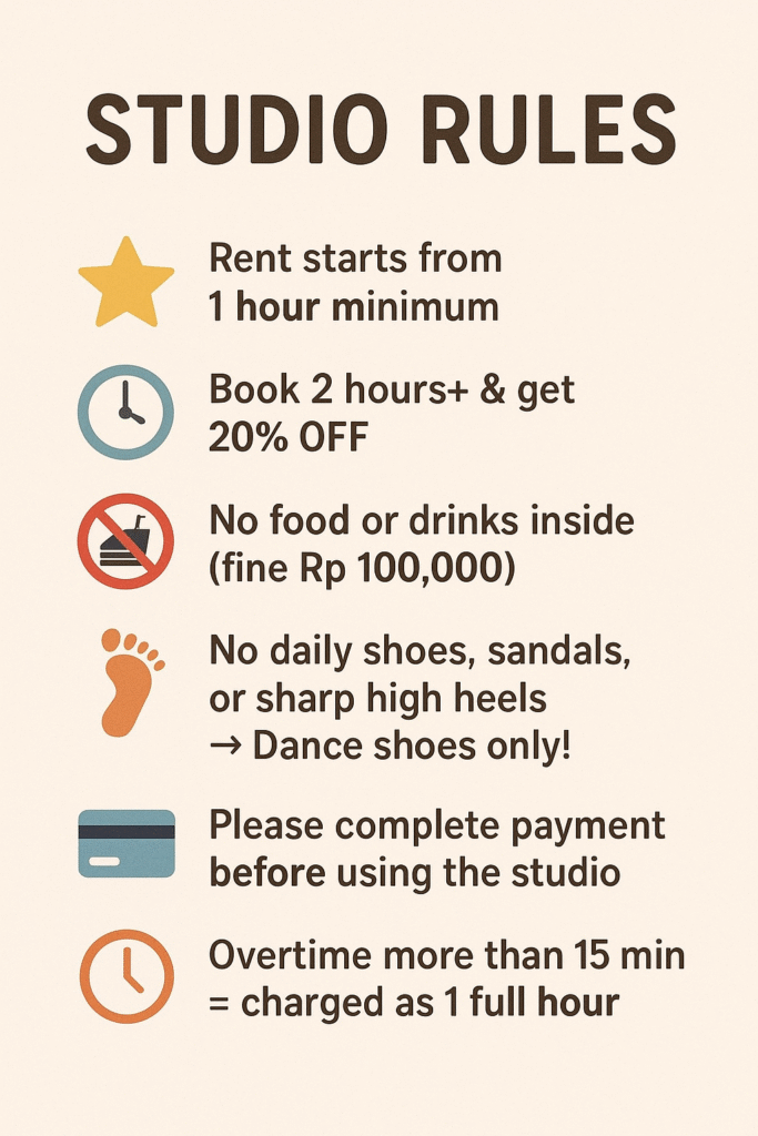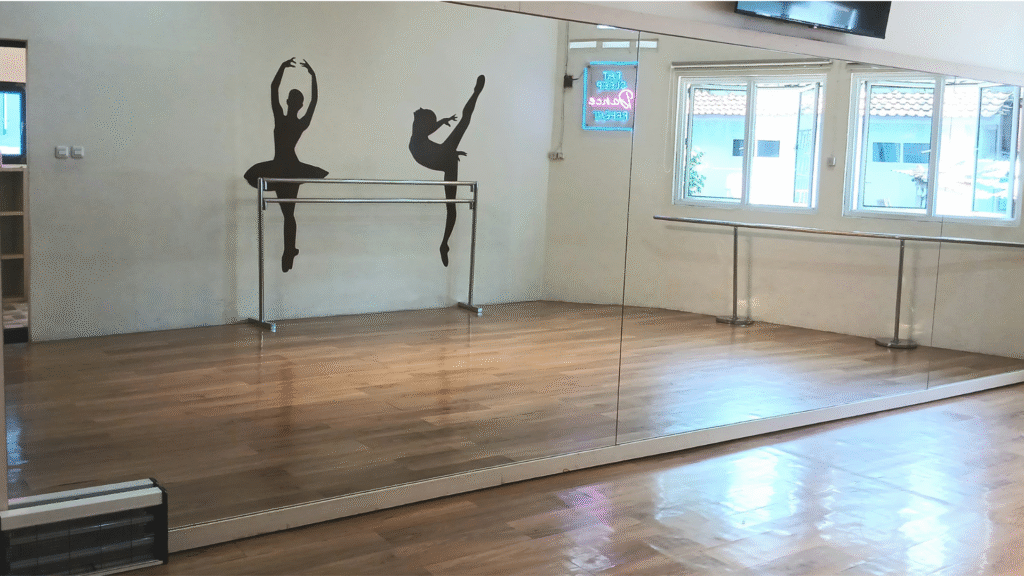 Facility : 8 m x 4 m, AC, TV, Sound system Bluetooth, Toilet outside the Studio, Vinyl Floor, Changing room